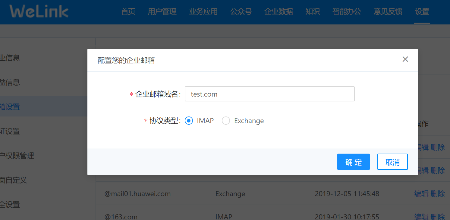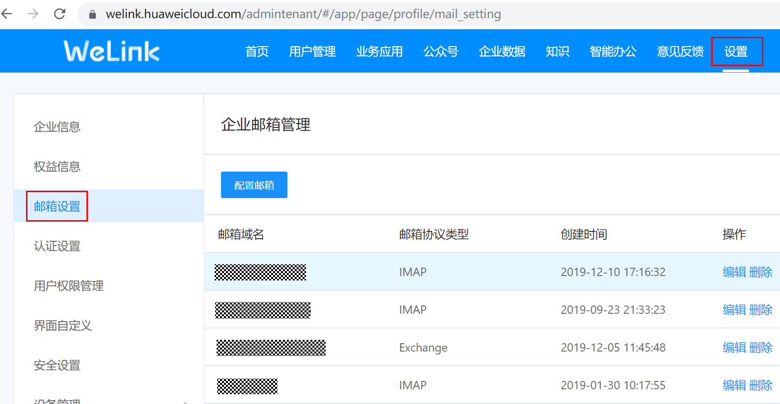 在2.2节中验证邮箱能够配置成功后,便可在WeLink后台管理中进行邮箱配置。打开网址http://welink.huaweicloud.com/,登陆WeLink后台管理。点击“设置”,“邮箱设置”,进入到如下图所示界面。